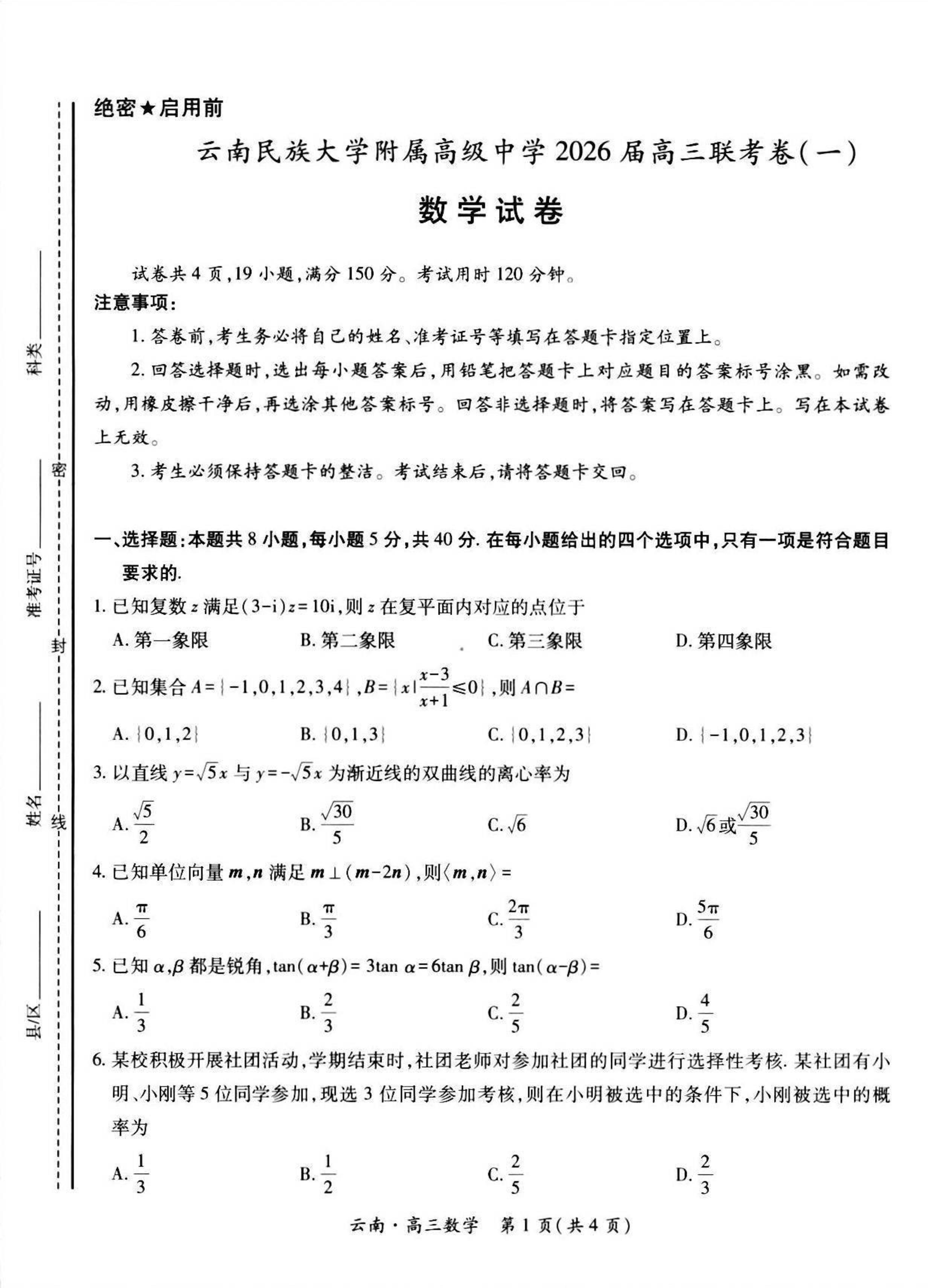 云南民族大学附属高级中学2026届高三上学期联考(一)数学试卷(含解析).pdf
