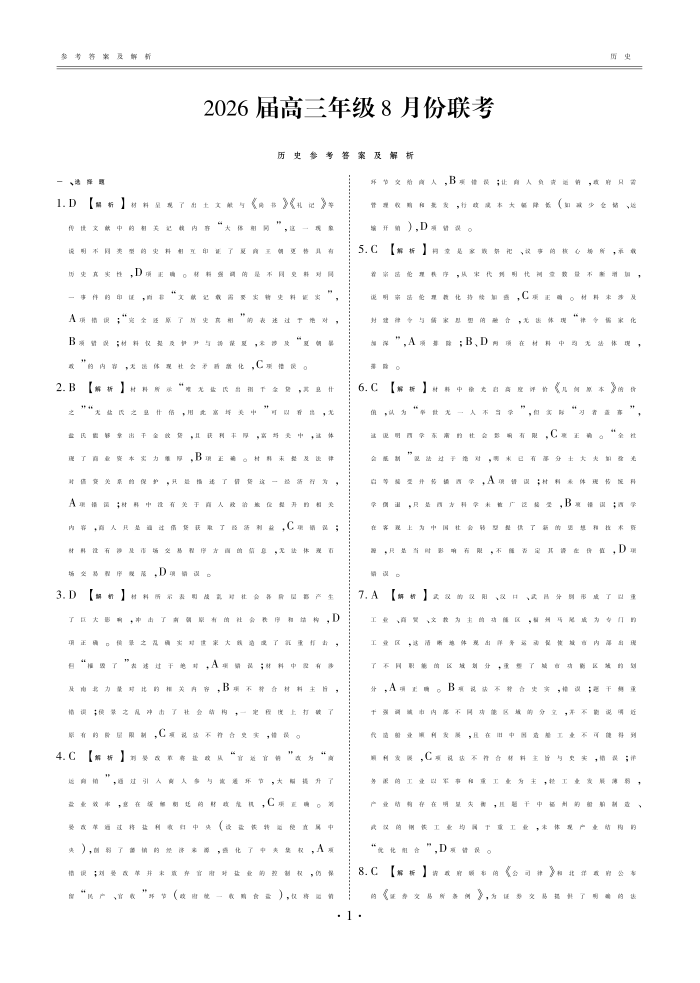 广东省衡水金卷2026届高三8月开学联考 历史答案.pdf
