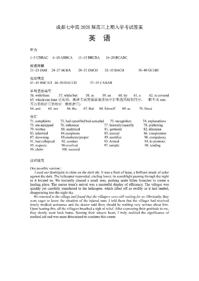 成都市第七中学2025-2026学年高三上学期8月入学考试 英语答案.pdf