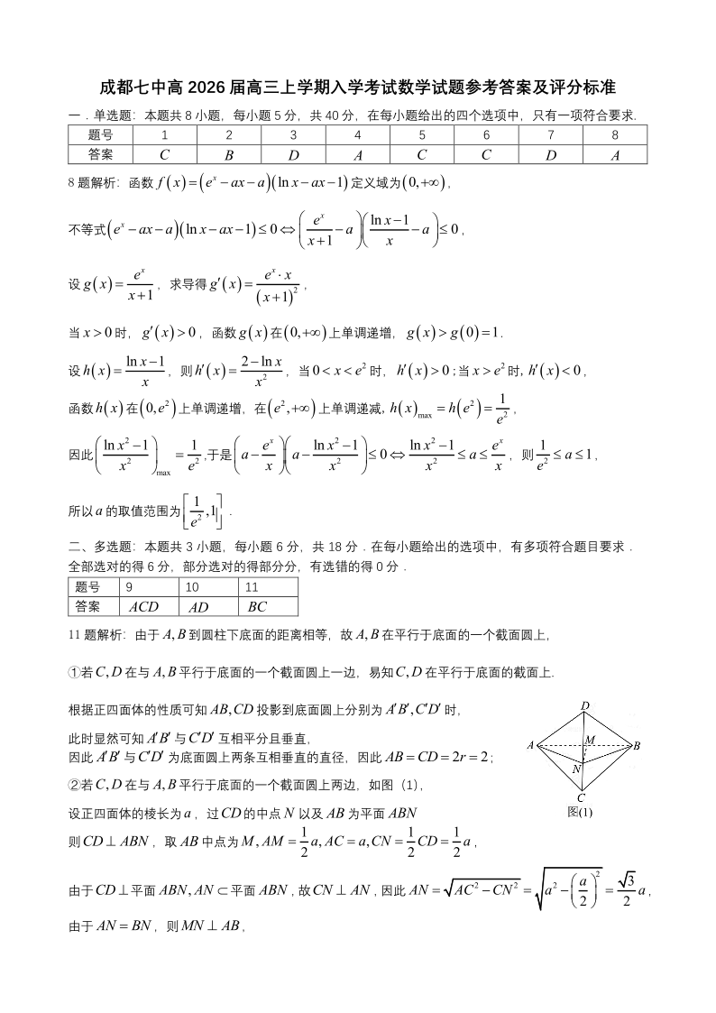 成都市第七中学2025-2026学年高三上学期8月入学考试 数学答案.pdf