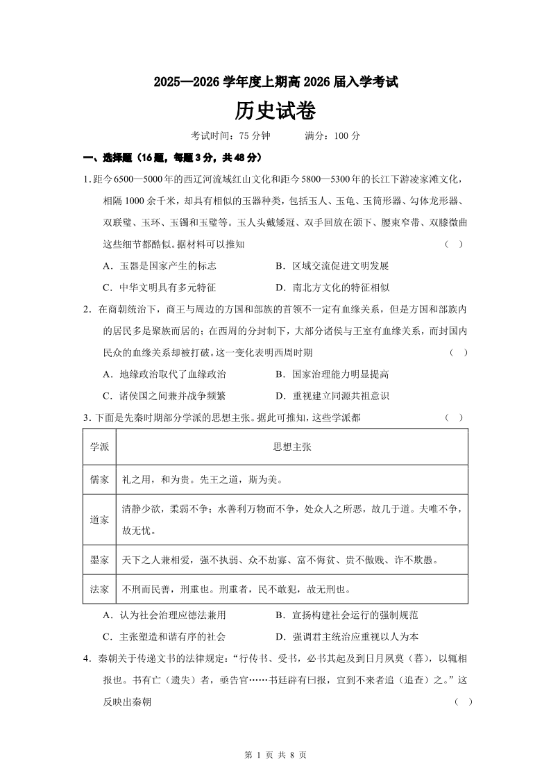 成都市第七中学2025-2026学年高三上学期8月入学考试 历史.pdf
