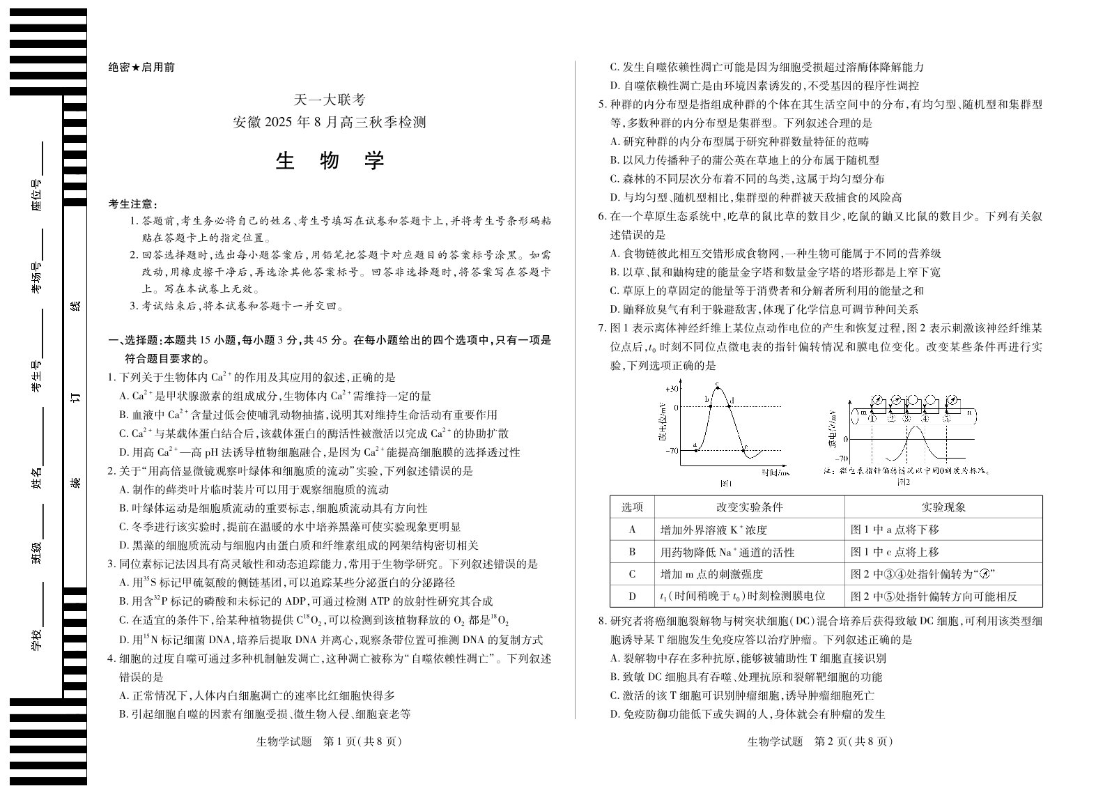 生物学安徽高三8月秋季检测试卷单色.pdf