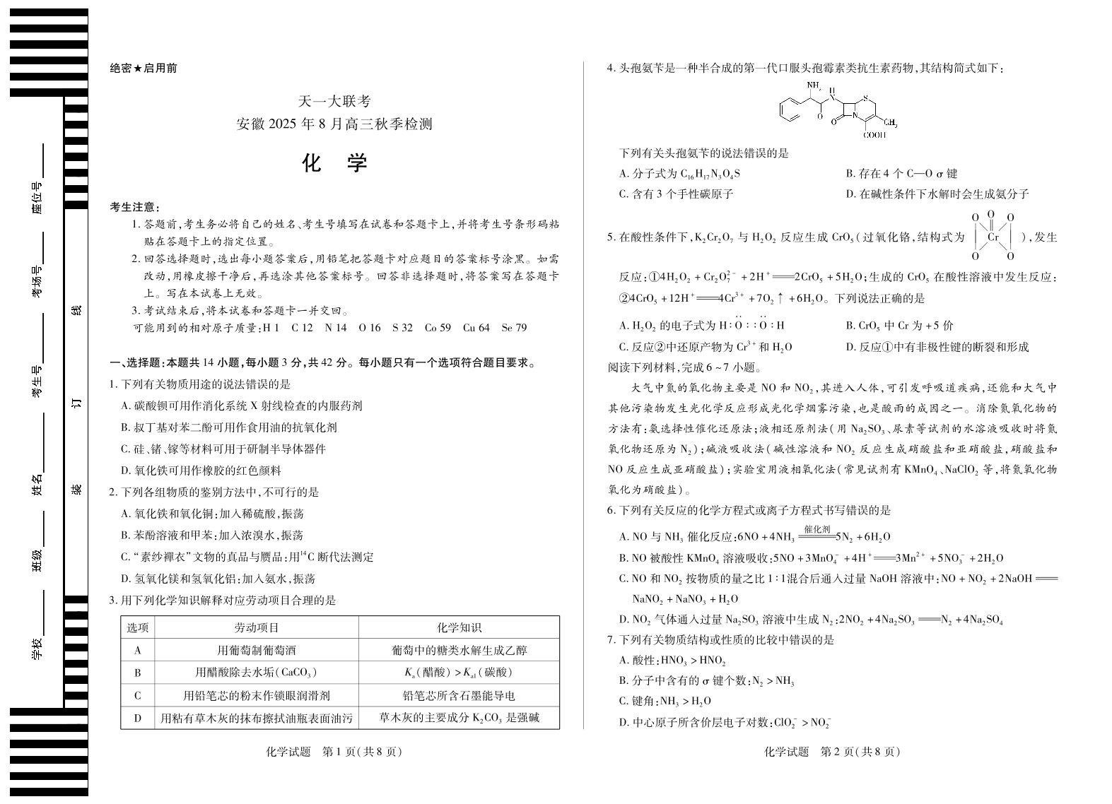 化学安徽高三8月秋季检测.pdf