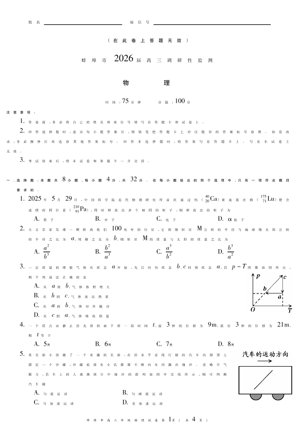 安徽省蚌埠市2025-2026学年高三上学期调研性监测 物理.pdf