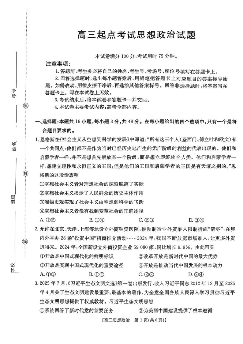 安徽省皖西南高中振兴发展联盟高三起点考试 政治.pdf