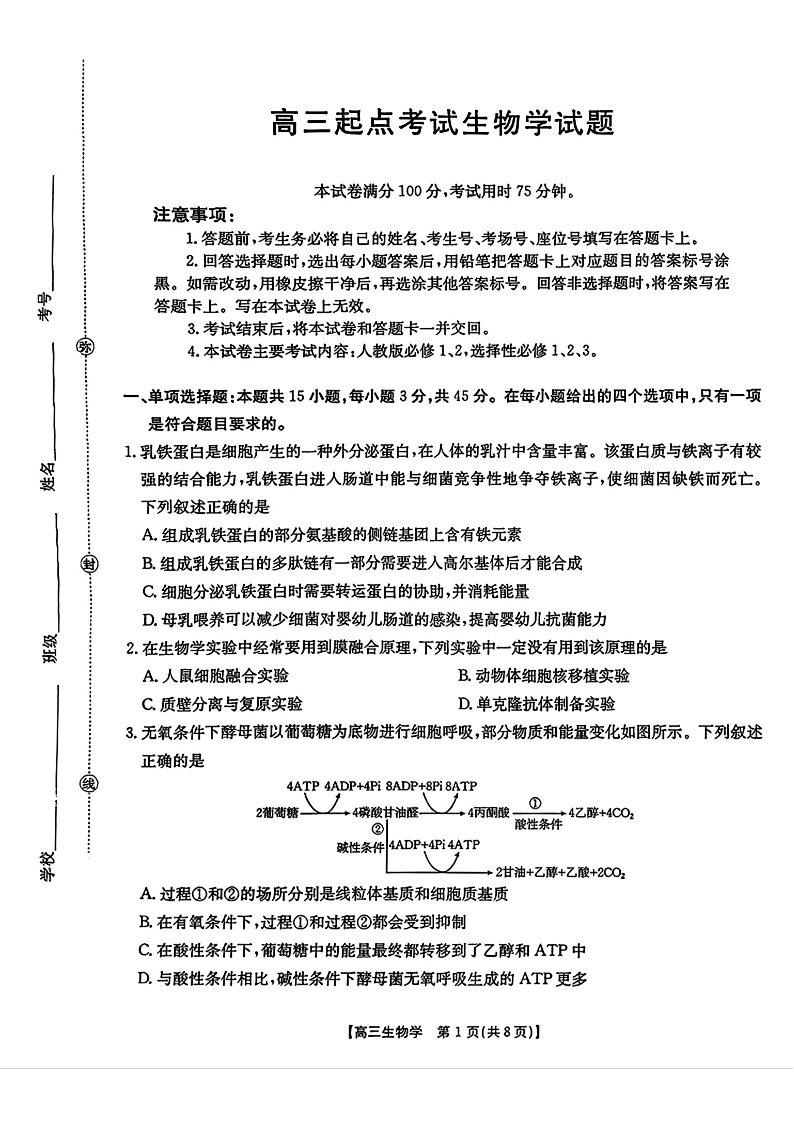 安徽省皖西南高中振兴发展联盟高三起点考试 生物.pdf