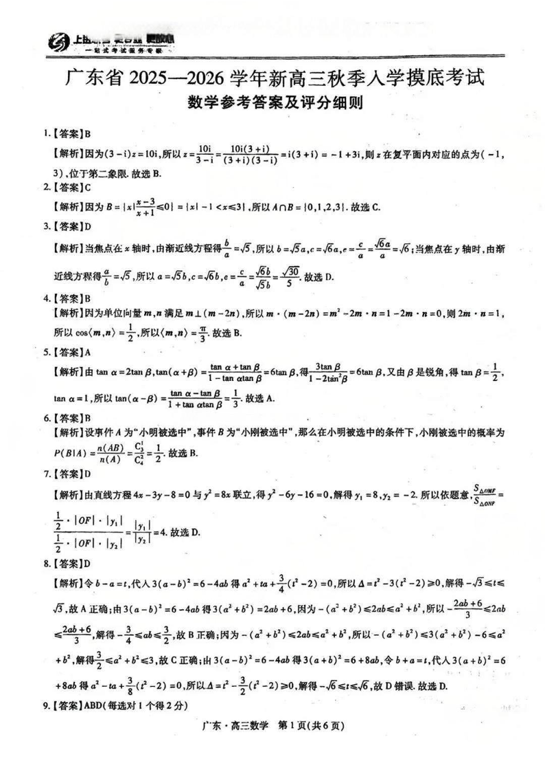 上进联考2025-2026学年新高三秋季入学摸底考试 数学答案.pdf