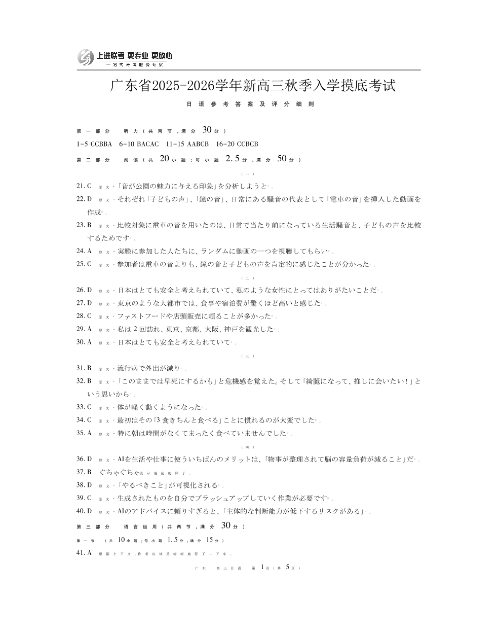 上进联考2025-2026学年新高三秋季入学摸底考试 日语答案.pdf