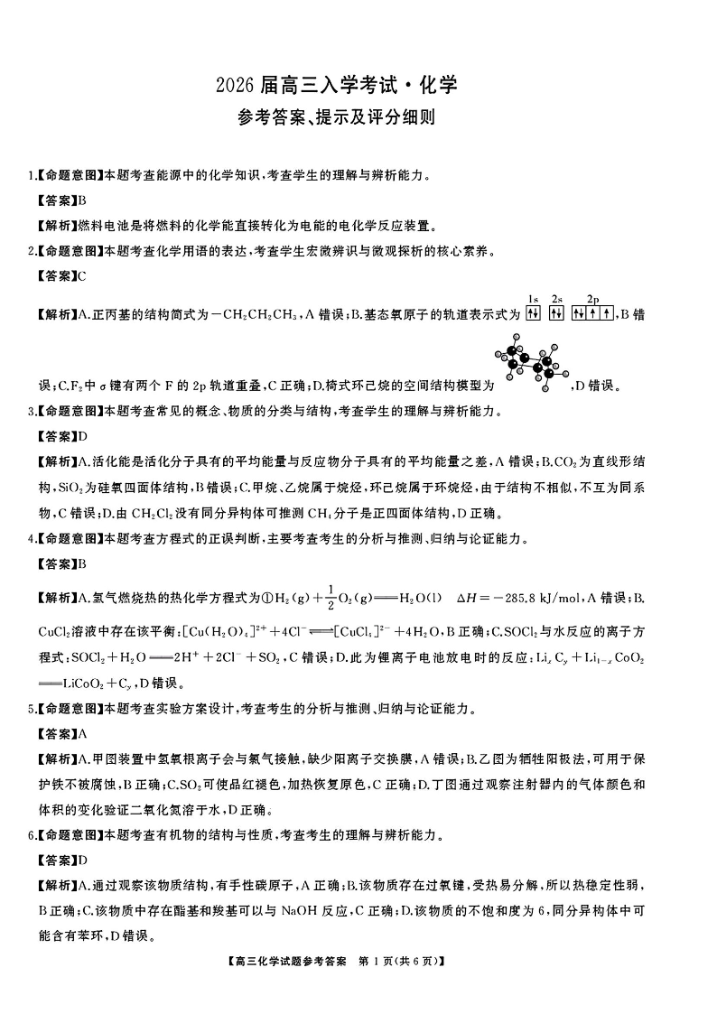 湖南省天壹名校联盟2026届高三8月入学考试 化学答案.pdf