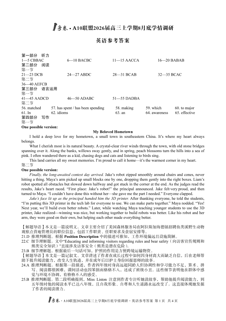 1号卷·A10联盟2026届高三上学期8月底学情调研 英语答案.pdf