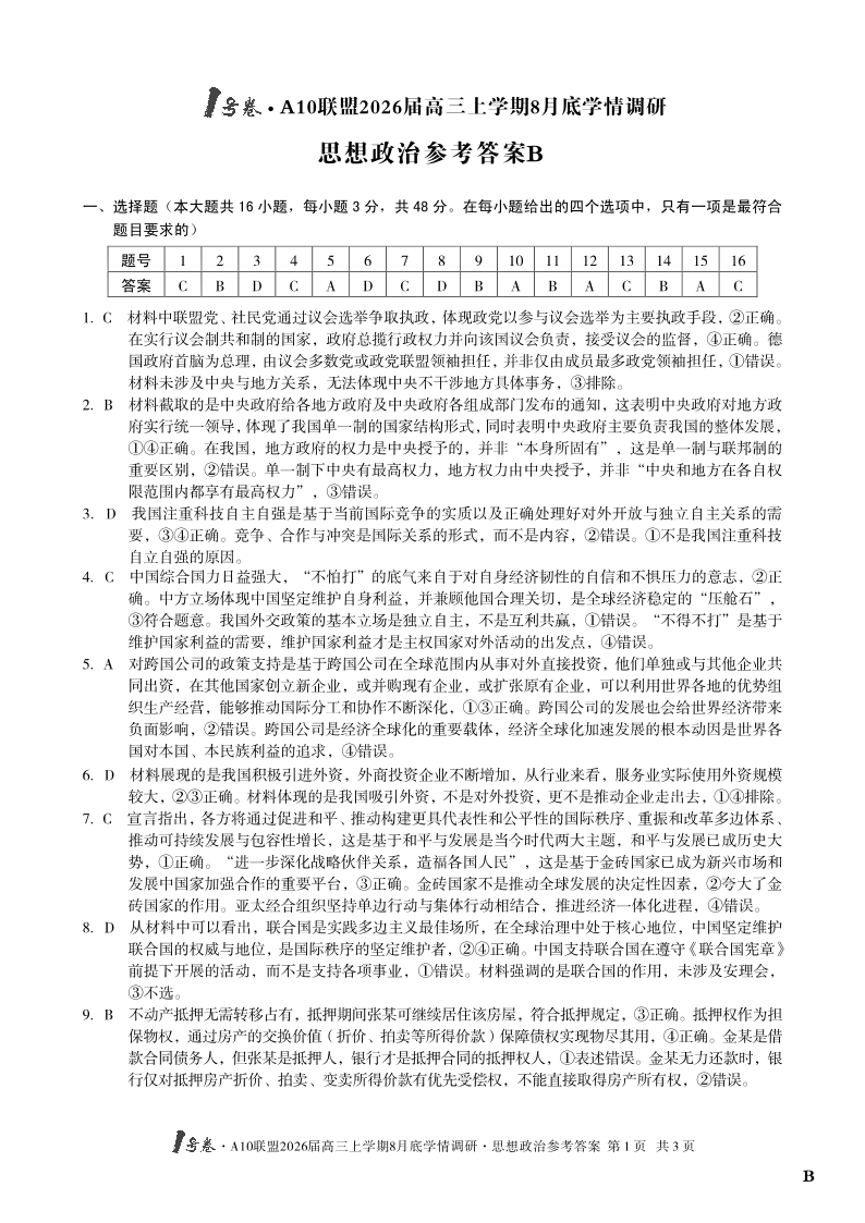 1号卷·A10联盟2026届高三上学期8月底学情调研 思想政治B卷答案.pdf