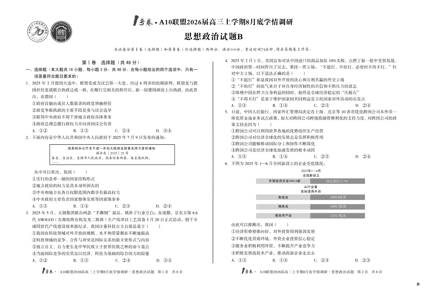 1号卷·A10联盟2026届高三上学期8月底学情调研 思想政治B卷.pdf