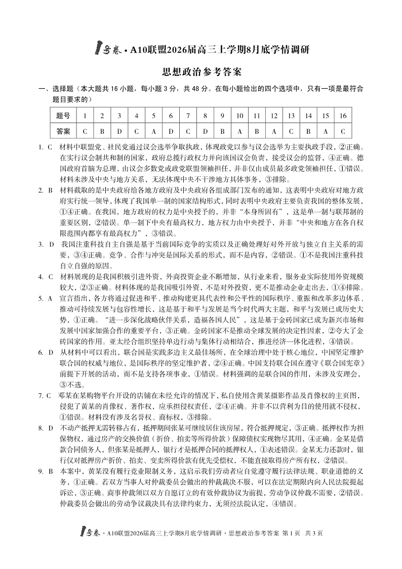 1号卷·A10联盟2026届高三上学期8月底学情调研 思想政治A卷答案.pdf