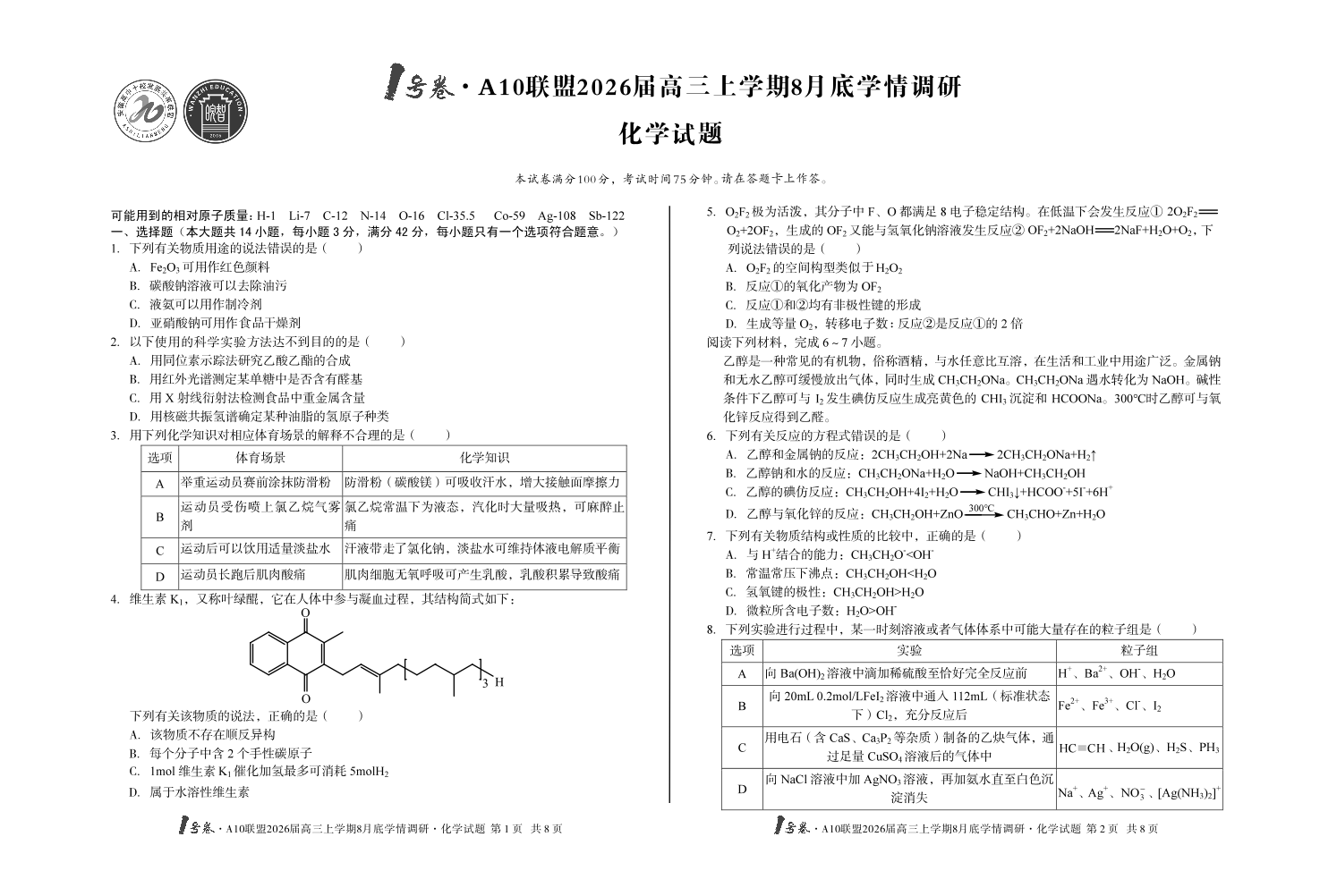 1号卷·A10联盟2026届高三上学期8月底学情调研 化学.pdf