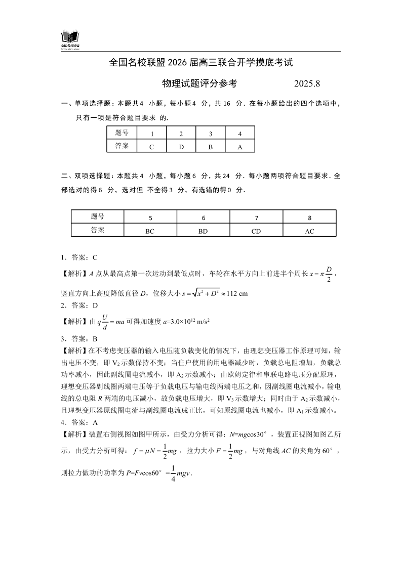 全国名校联盟2026届高三开学摸底考试 物理答案.pdf
