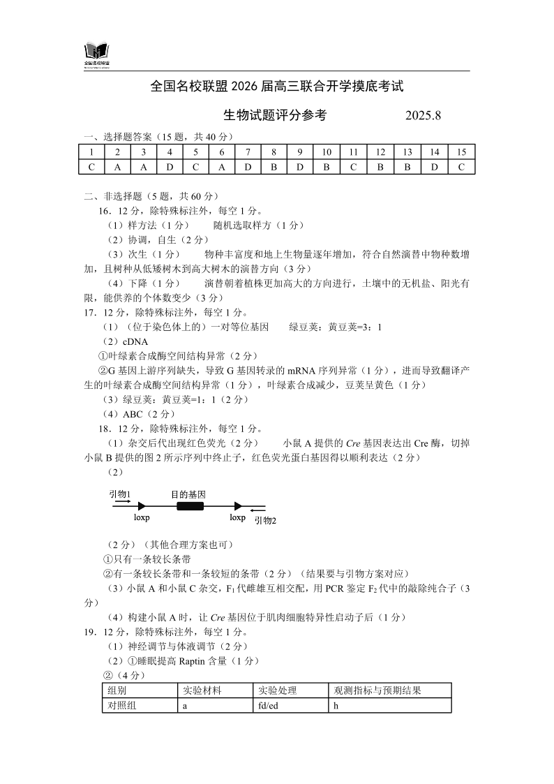 全国名校联盟2026届高三开学摸底考试 生物答案.pdf