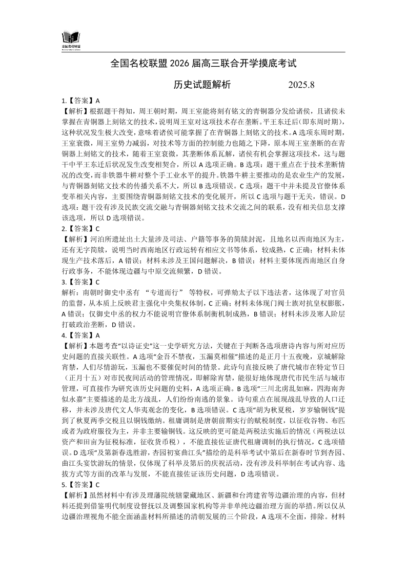 全国名校联盟2026届高三开学摸底考试 历史答案.pdf