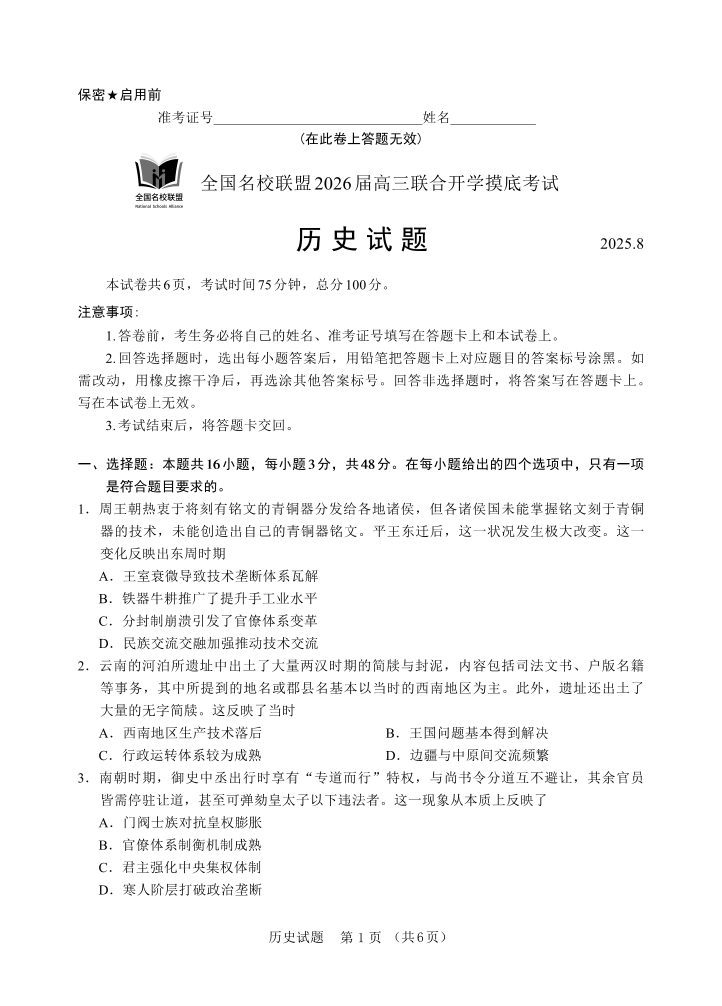 全国名校联盟2026届高三开学摸底考试 历史.pdf