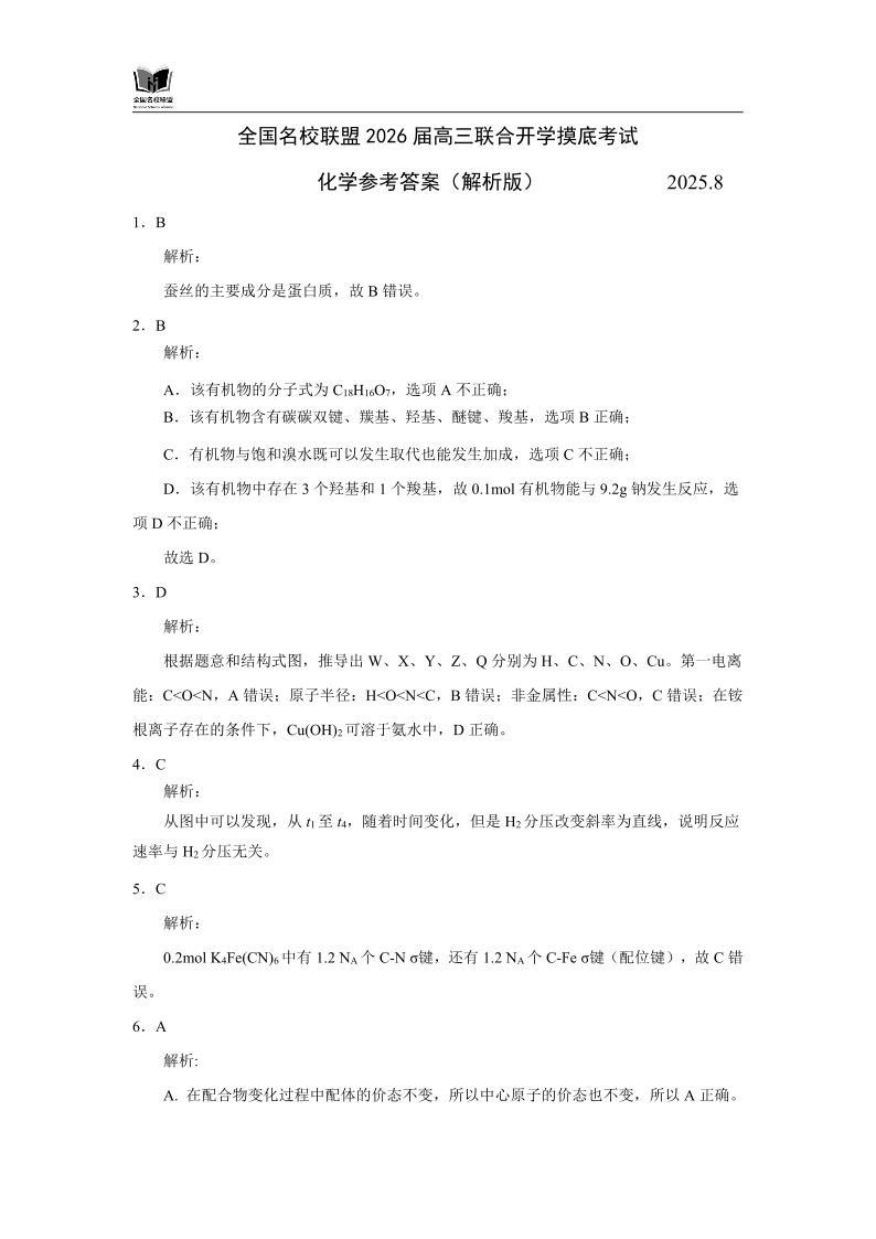 全国名校联盟2026届高三开学摸底考试 化学答案.pdf