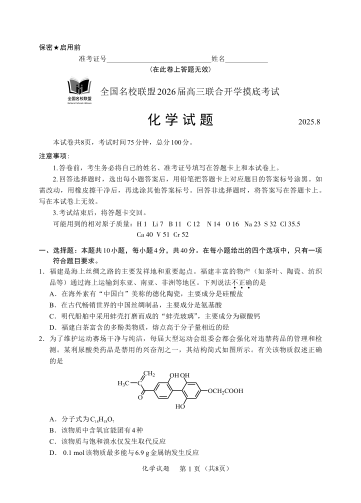 全国名校联盟2026届高三开学摸底考试 化学.pdf