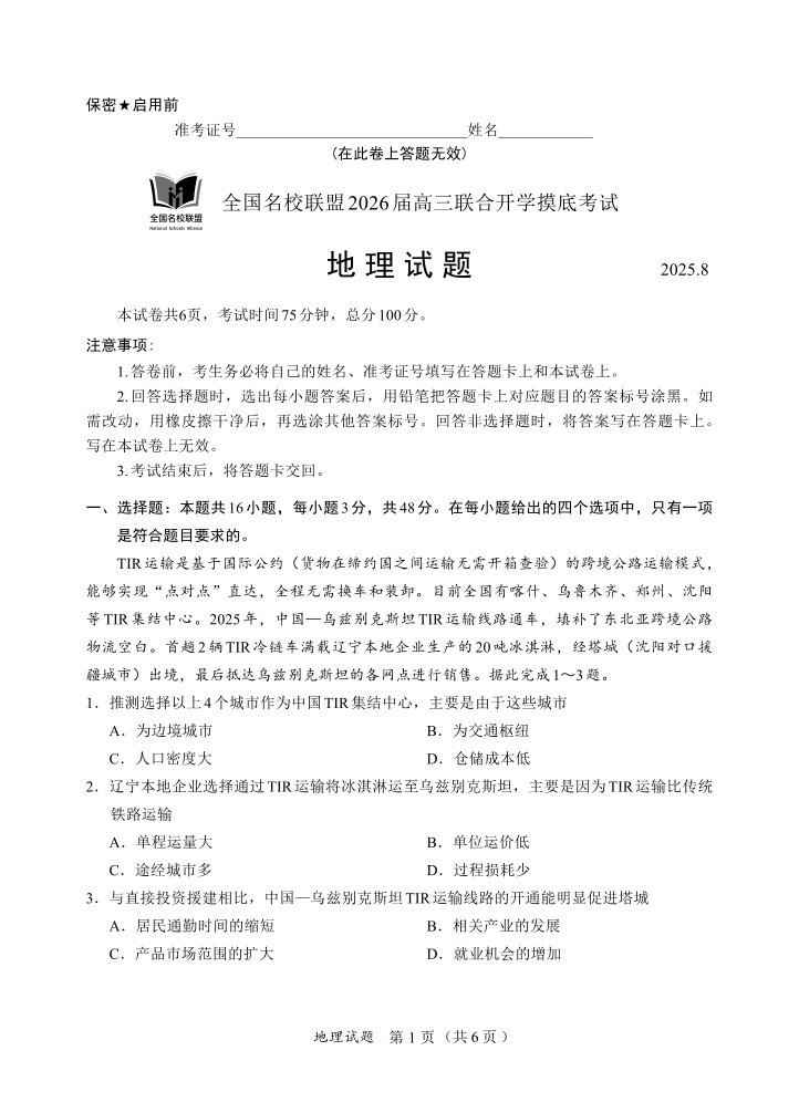 全国名校联盟2026届高三开学摸底考试 地理.pdf