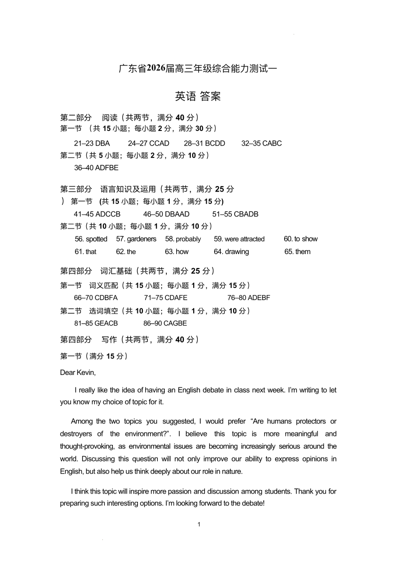 广东省2026届高三年级综合能力测试一 英语答案.pdf