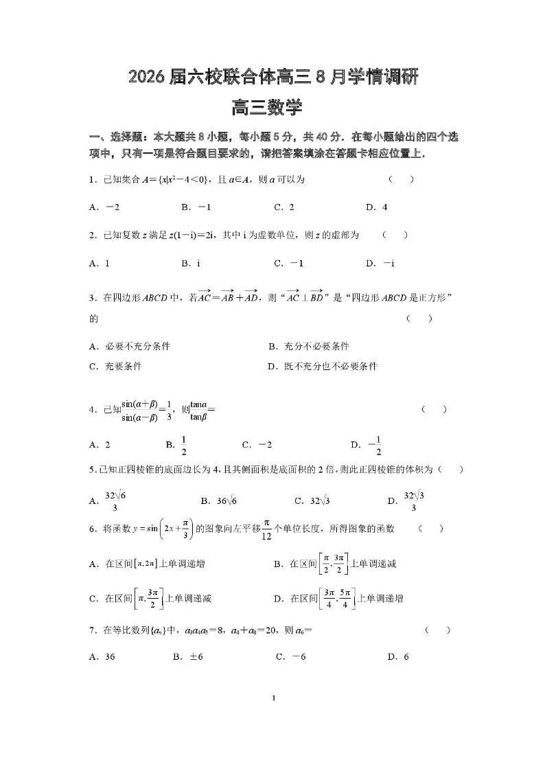 江苏省南京市2026届六校联合体高三8月学情调研考试 数学试卷(含答案).pdf