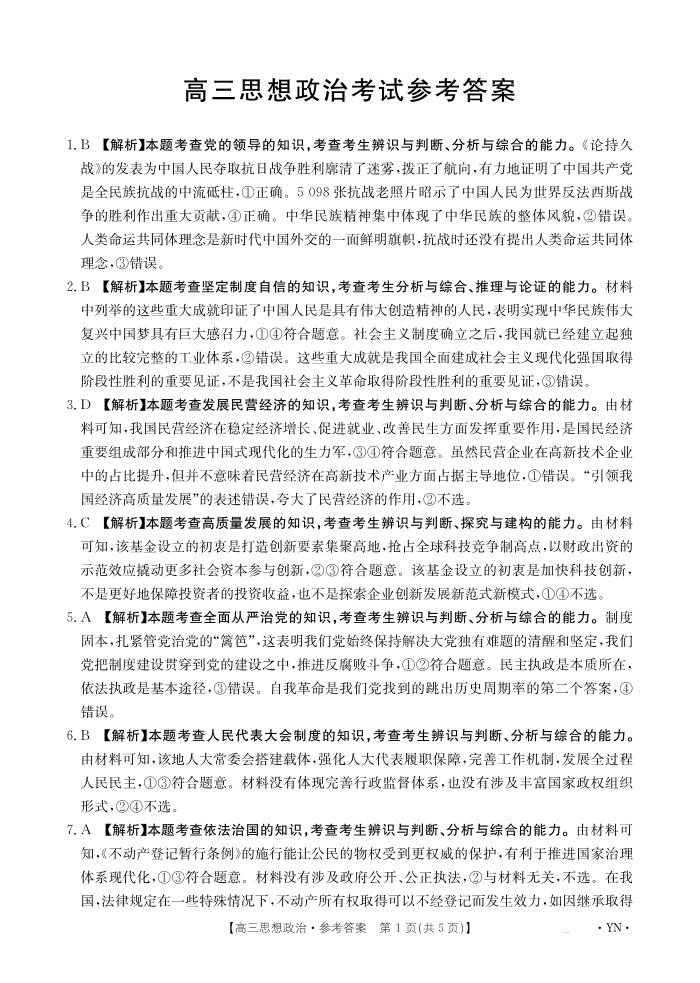 云南省金太阳2026届高三8月开学联考(YN)政治答案.pdf