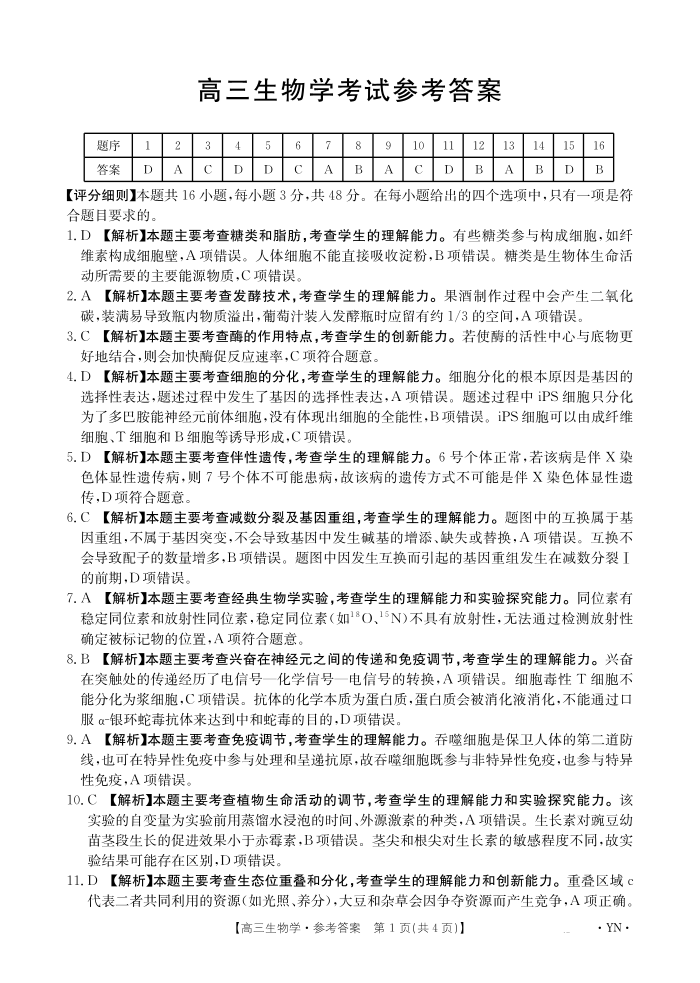 云南省金太阳2026届高三8月开学联考(YN)生物答案.pdf