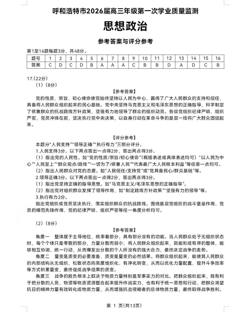 呼和浩特市2025-2026学年高三年级第一次质量监测 政治答案.pdf