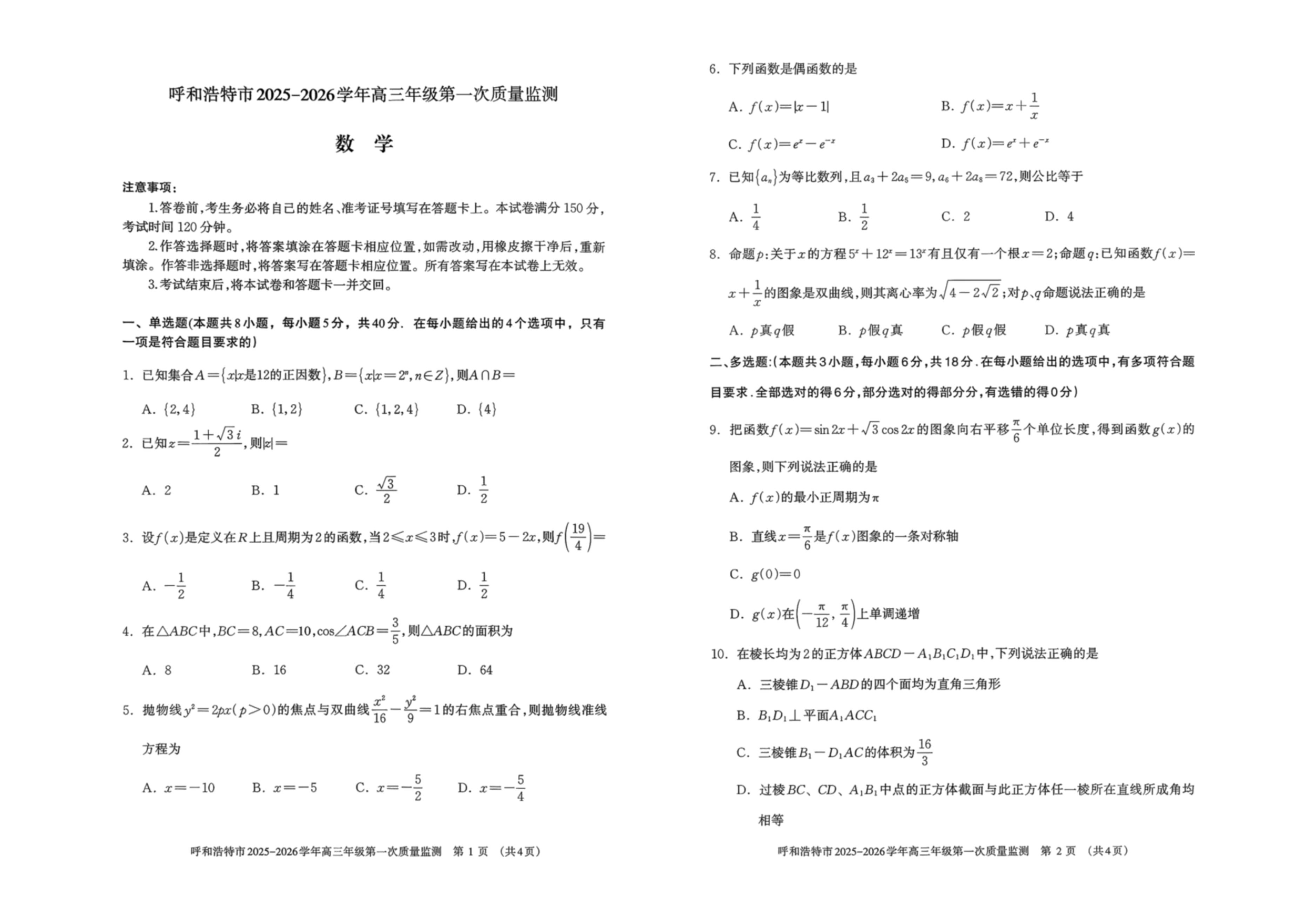 呼和浩特市2025-2026学年高三年级第一次质量监测 数学.pdf