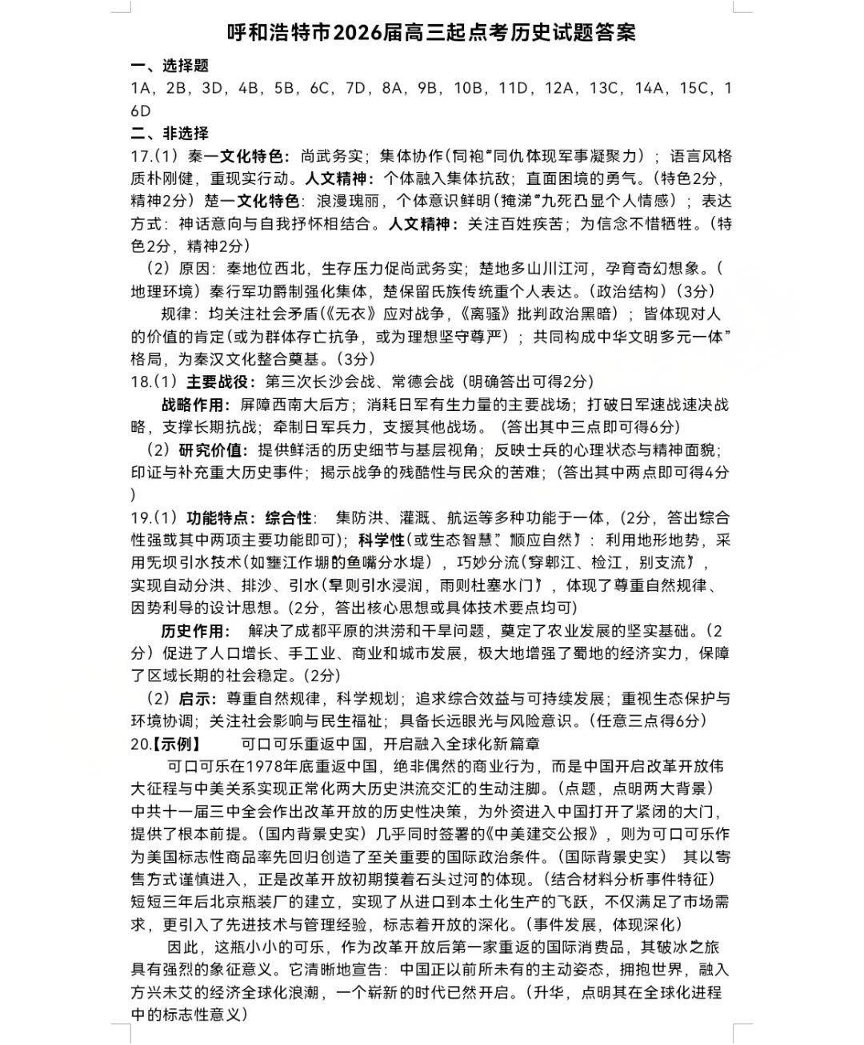 呼和浩特市2025-2026学年高三年级第一次质量监测 历史答案.pdf