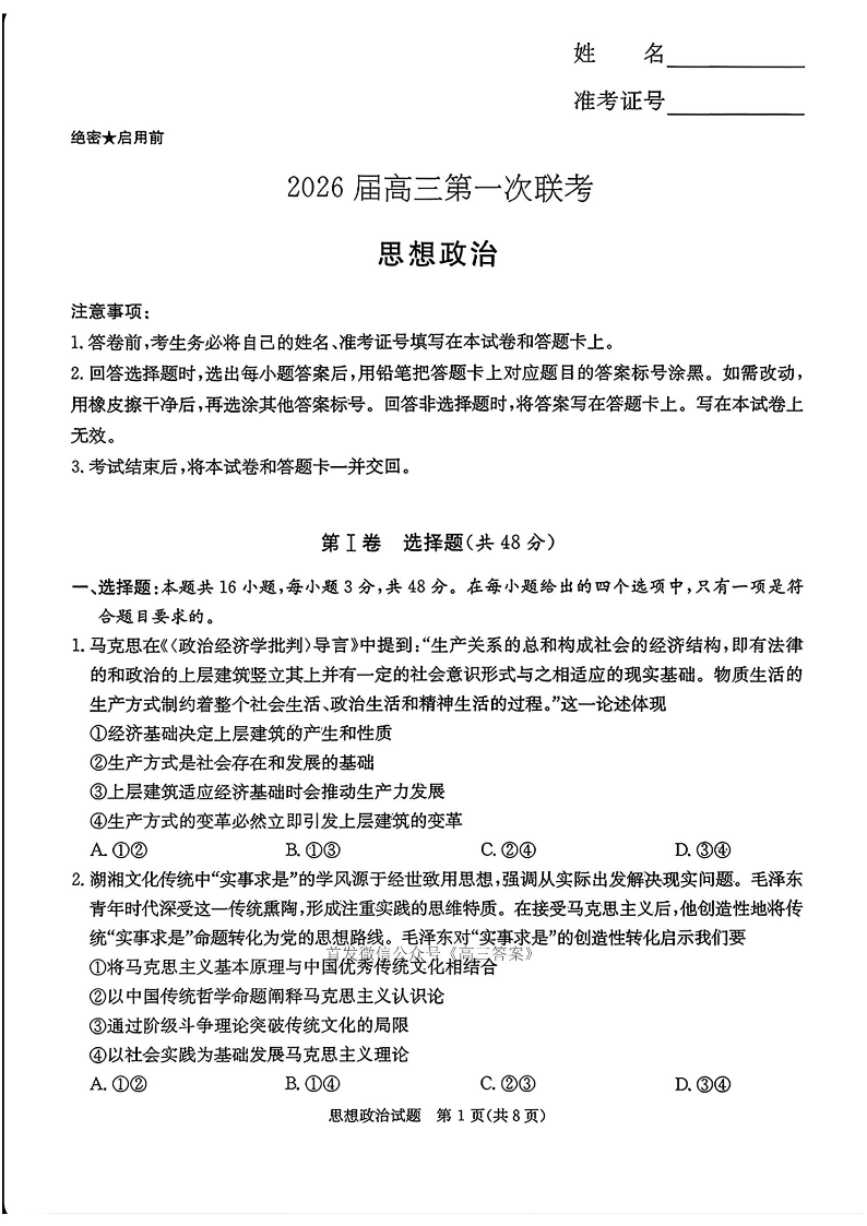湖南省炎德英才2026届高三第一次联考 政治.pdf
