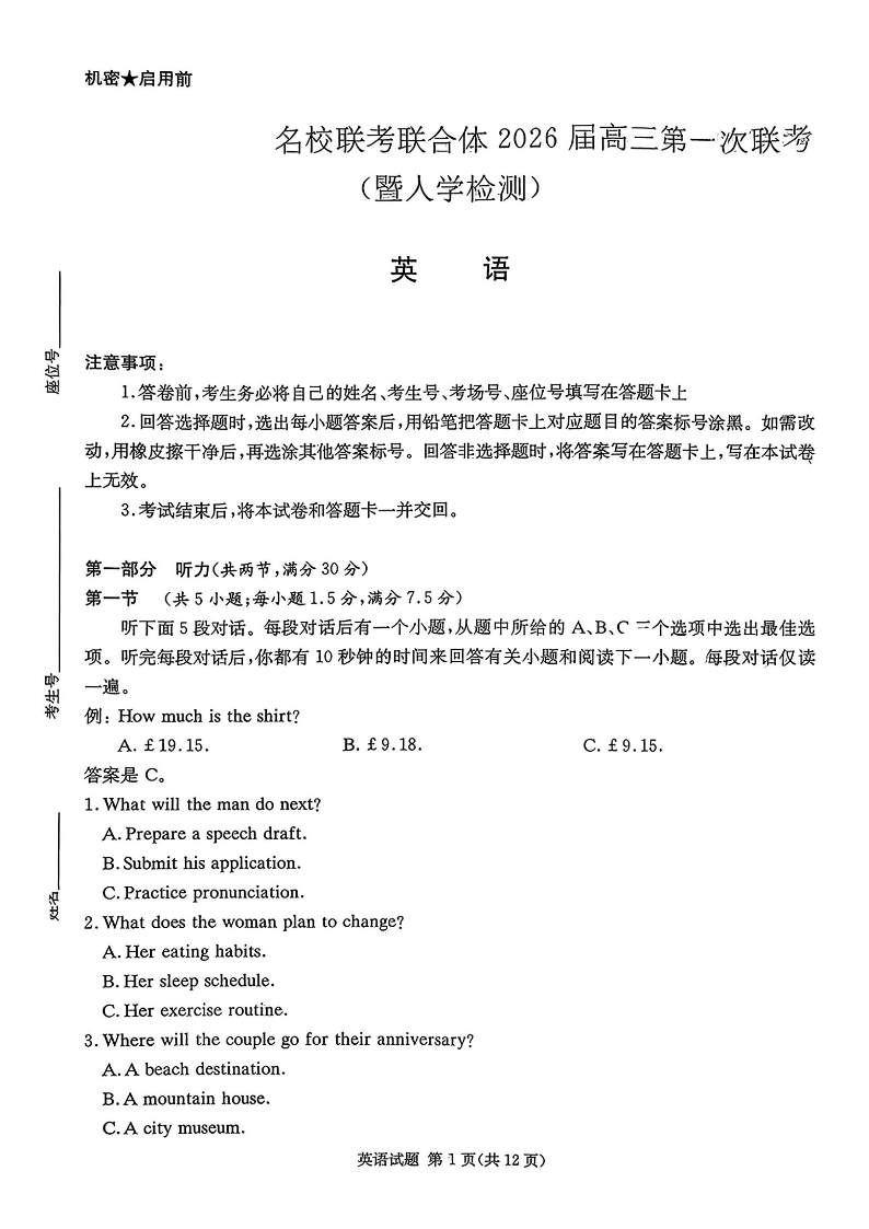 湖南省炎德英才2026届高三第一次联考 英语.pdf