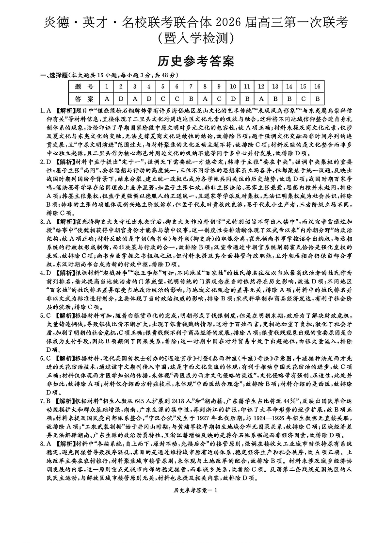 湖南省炎德英才2026届高三第一次联考 历史答案.pdf