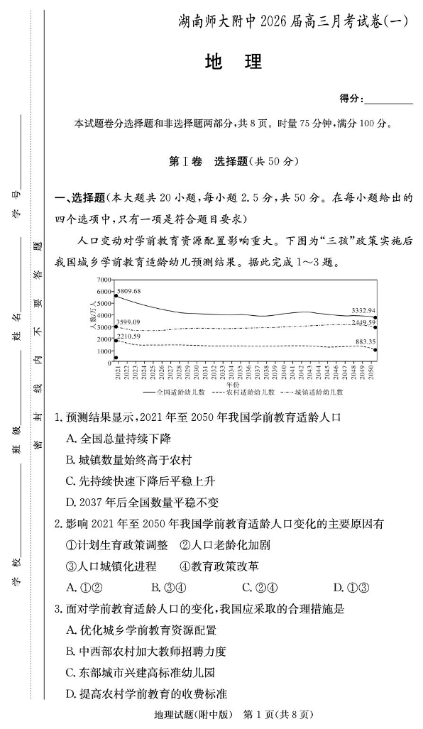 湖南师大附中2026届高三月考试卷(一)地理试卷(含答案).pdf