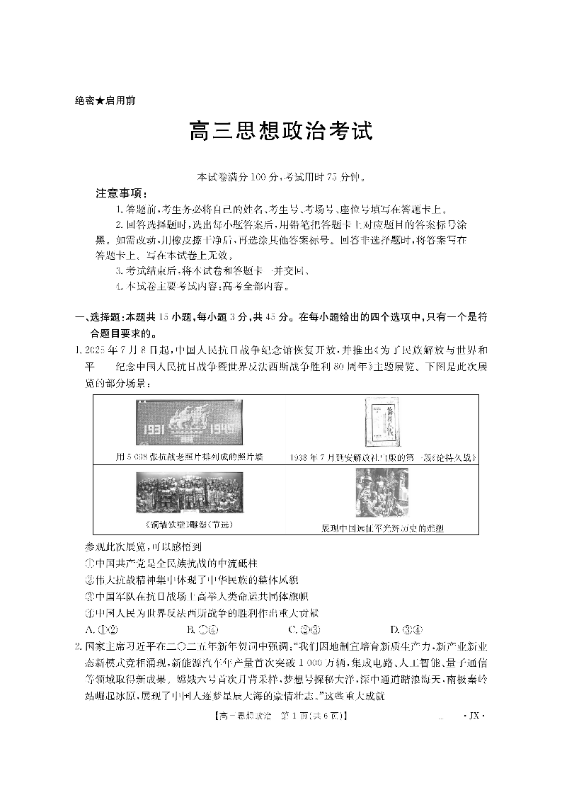 金太阳·江西省2026届高三上学期8月百万大联考 政治.pdf