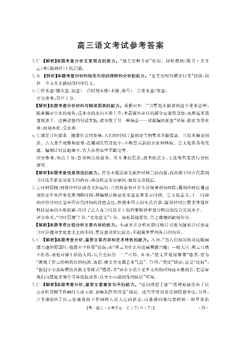 金太阳·江西省2026届高三上学期8月百万大联考 语文答案.pdf