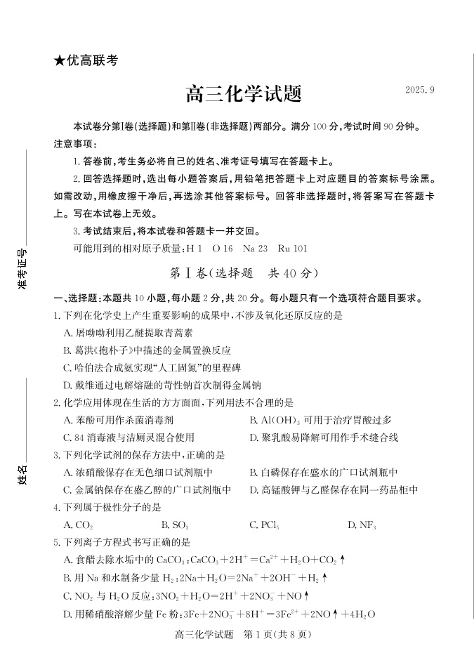 优高联考2026届高三上学期开学考试 化学.pdf