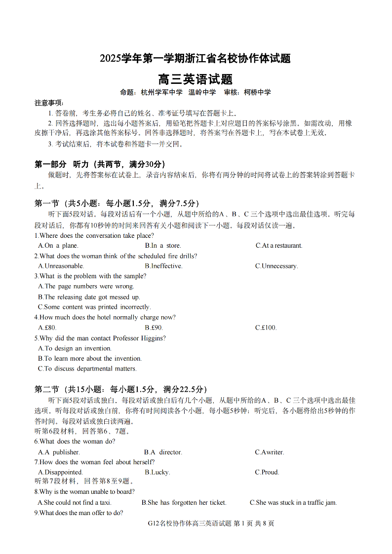 G12名校协作体2025学年第一学期高三9月暑假返校考 英语.pdf