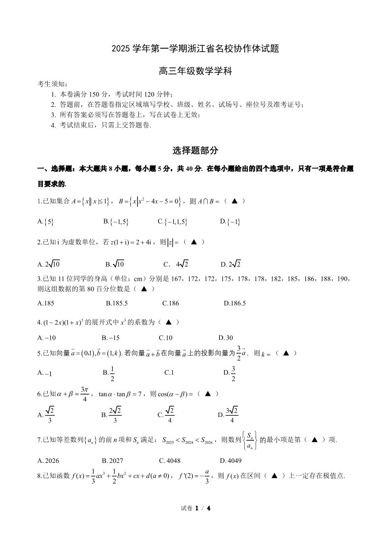 G12名校协作体2025学年第一学期高三9月暑假返校考 数学.pdf