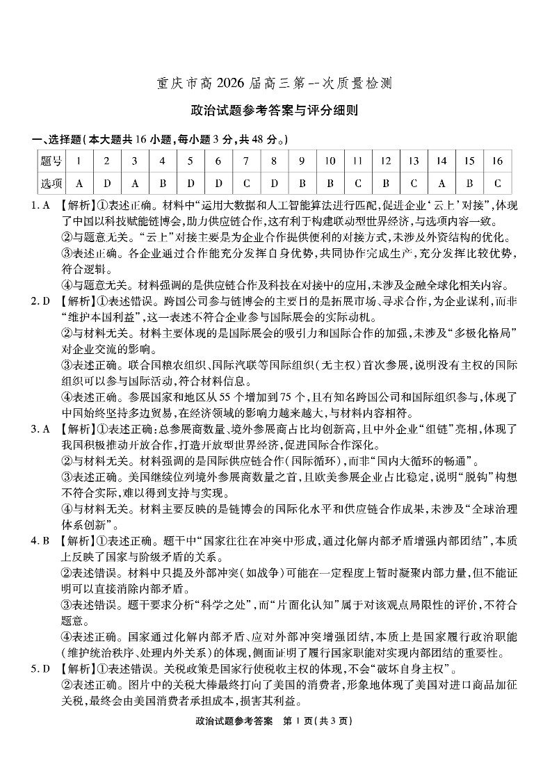 重庆市南开中学高2026届高三第一次质量检测 政治答案.pdf
