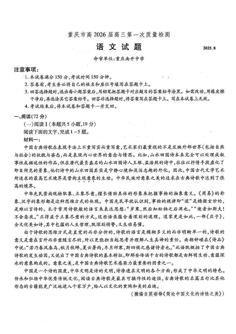 重庆市南开中学高2026届高三第一次质量检测 语文.pdf