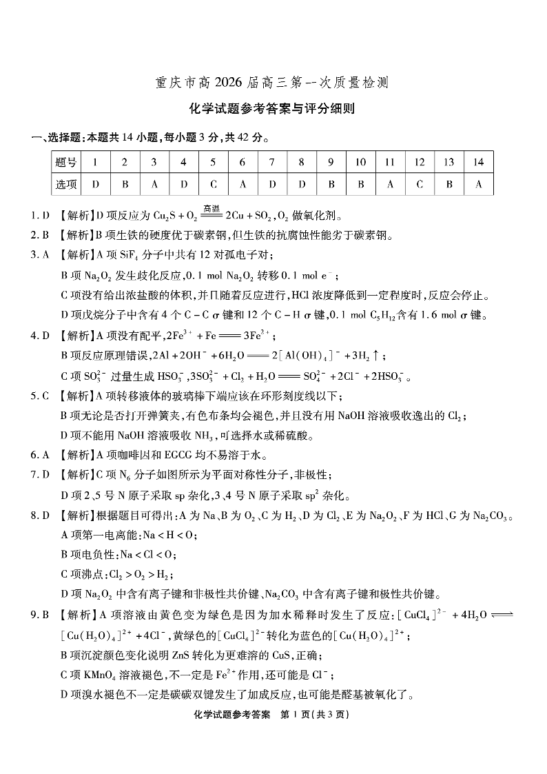 重庆市南开中学高2026届高三第一次质量检测 化学答案.pdf