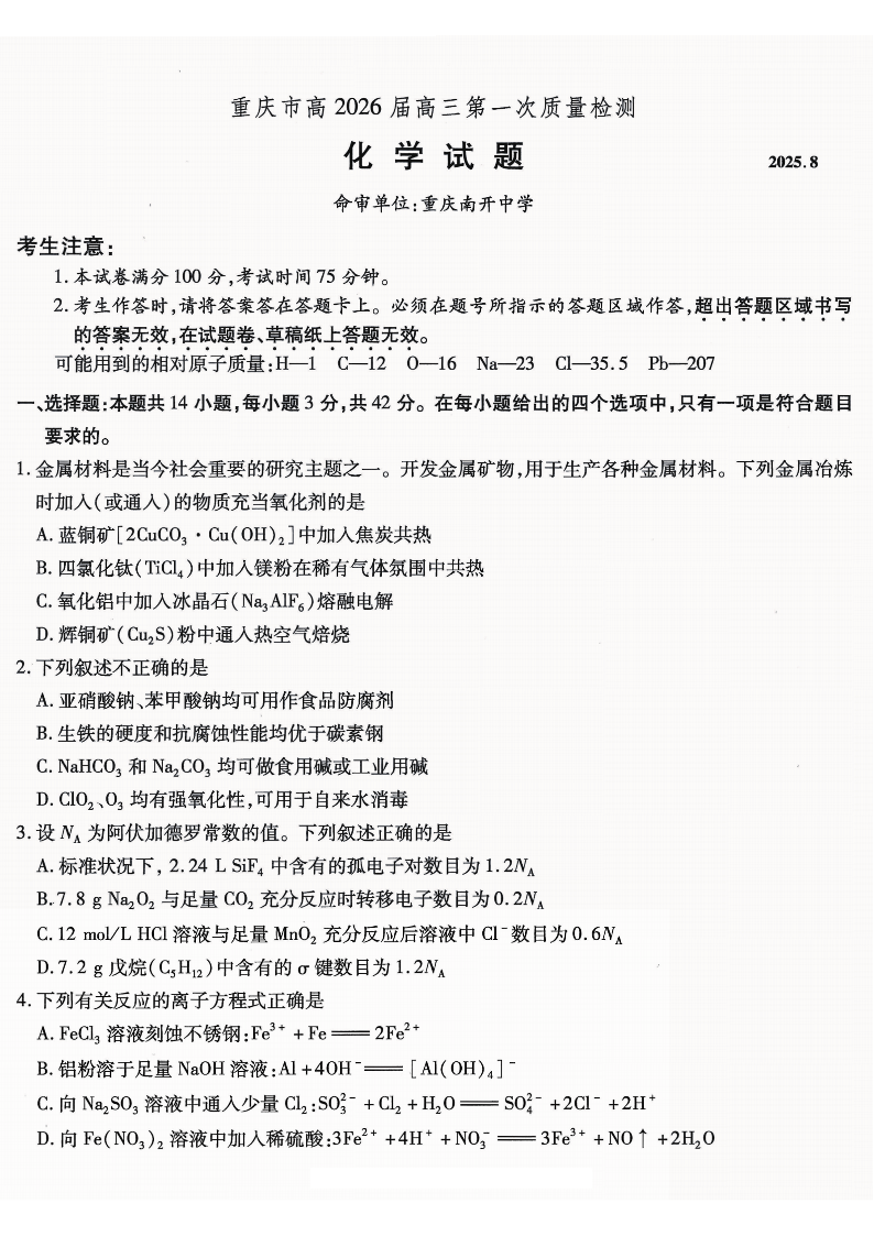 重庆市南开中学高2026届高三第一次质量检测 化学.pdf