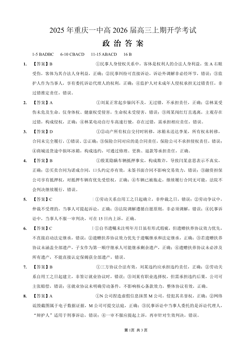 重庆一中高2026届高三上期开学考试 政治答案.pdf