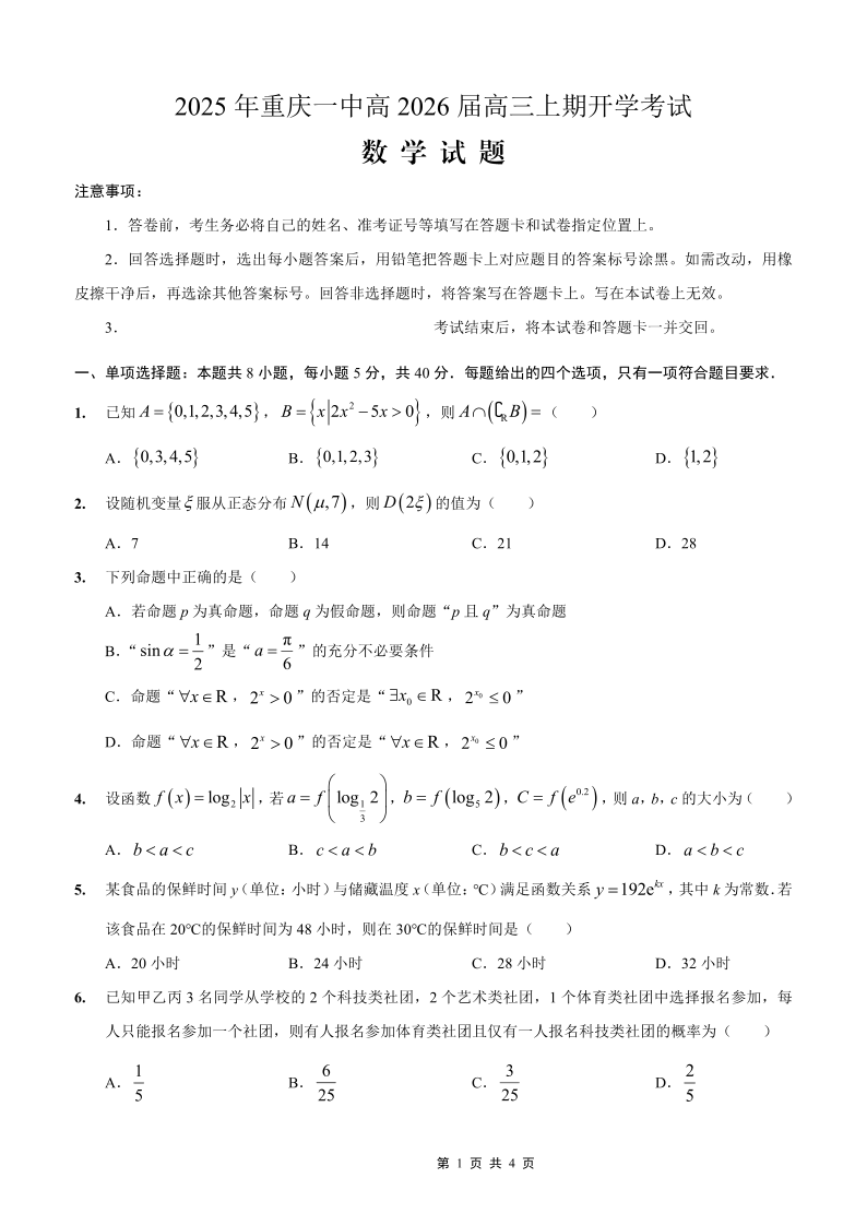 重庆一中高2026届高三上期开学考试 数学.pdf