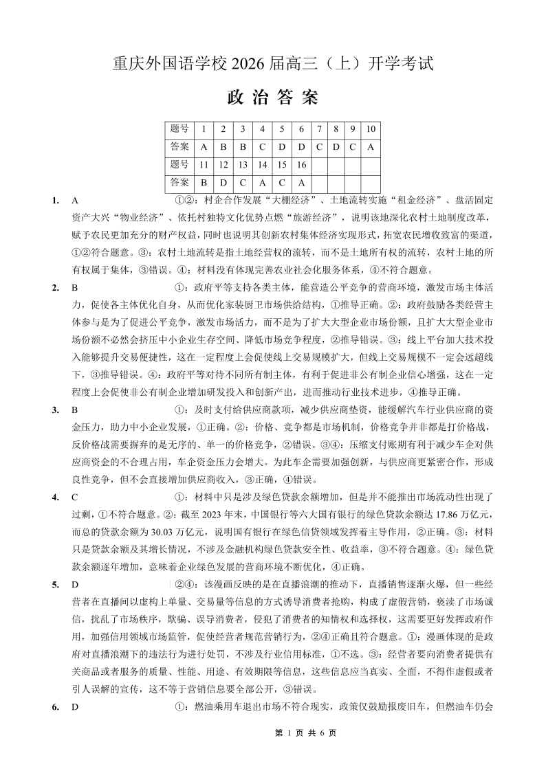 重庆外国语学校2026届高三(上)开学考试 政治答案.pdf