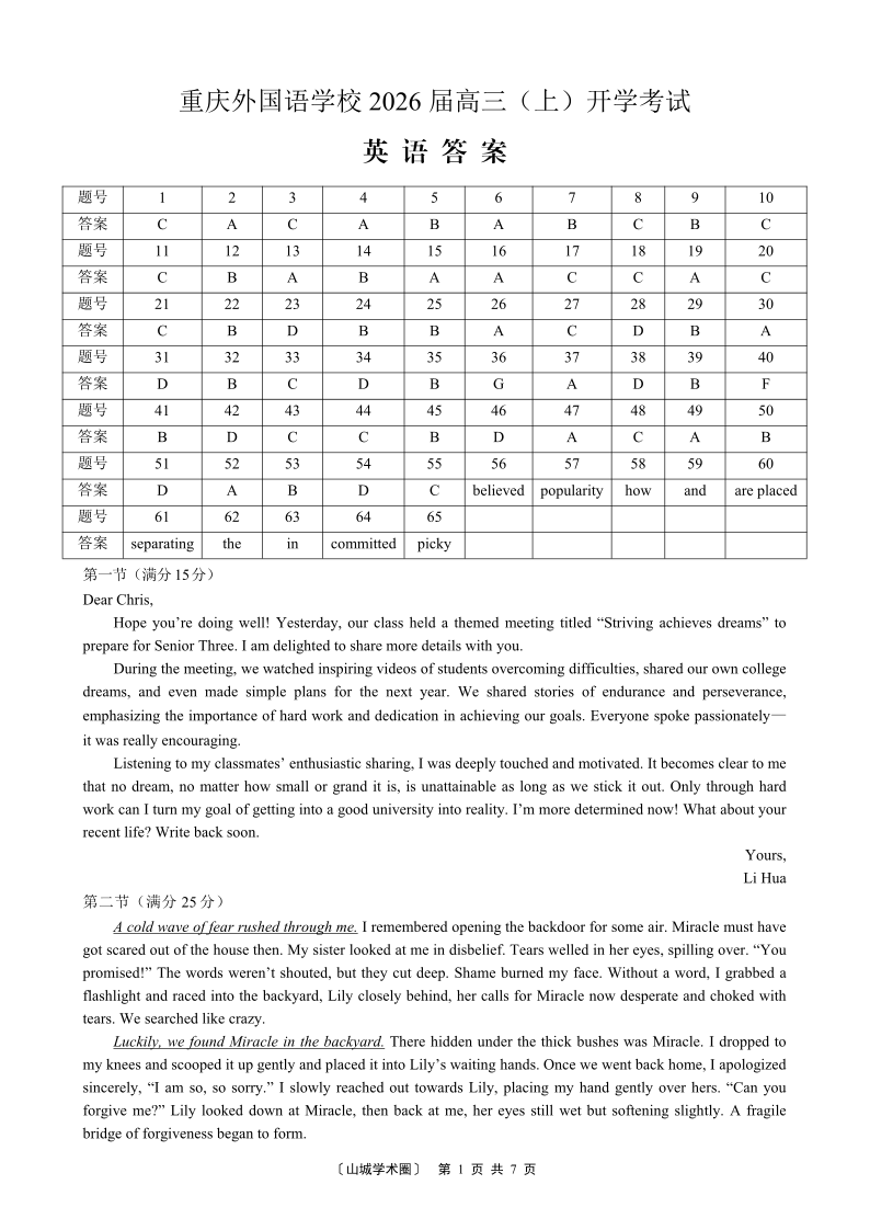 重庆外国语学校2026届高三(上)开学考试 英语答案.pdf