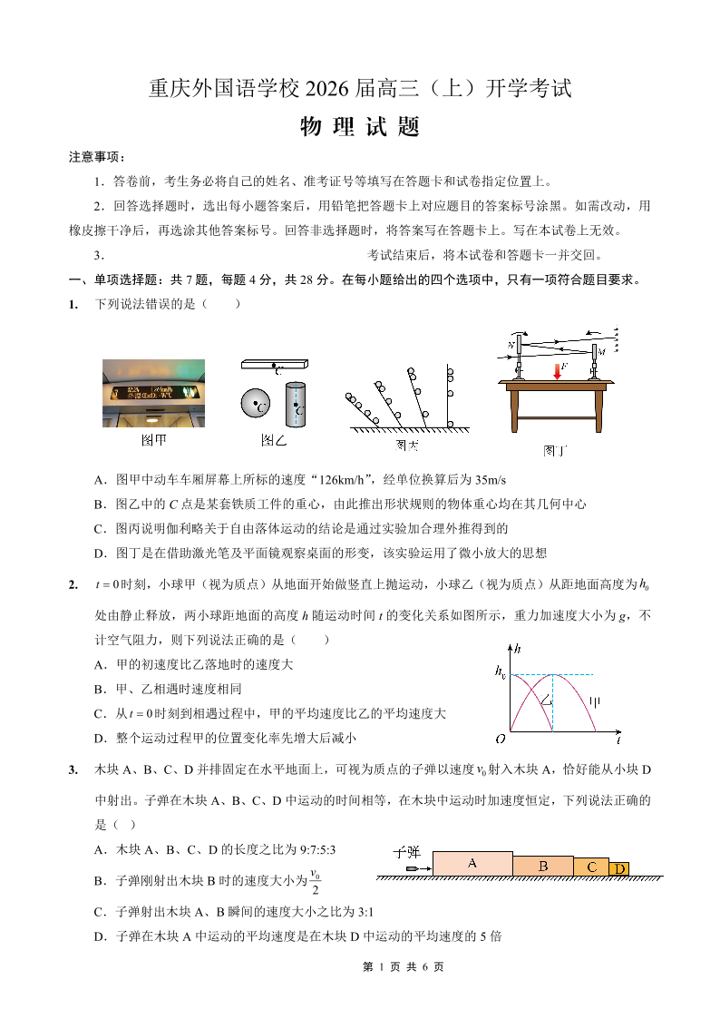重庆外国语学校2026届高三(上)开学考试 物理.pdf